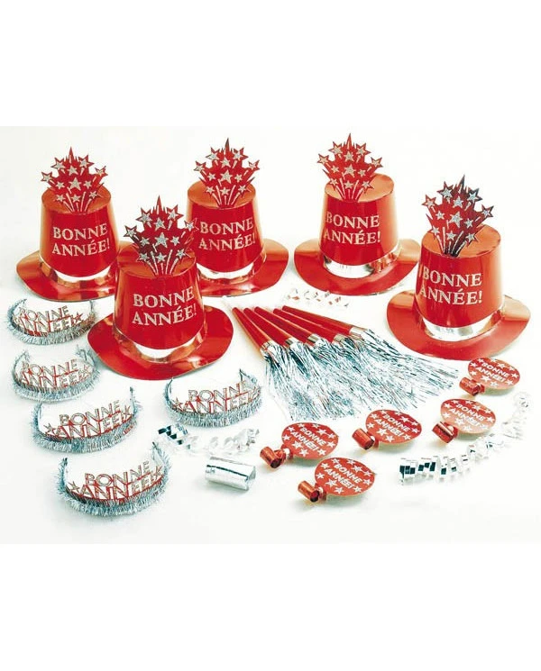 – Le kit est composé de 5 chapeaux haut-de-forme carton hologramme rouge, 5 couronnes hologramme rouge imprimées, 5 sans-gêne rouge, 5 trompettes rouge et 1 rouleau de 10 serpentins rouge.
