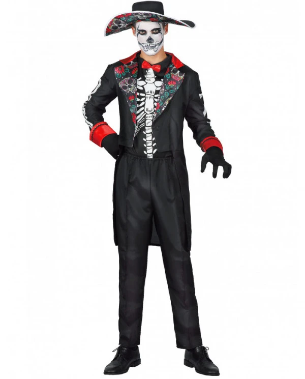 Découvrez le super déguisement jour des morts version squelette pour adulte ! Il contient une belle veste de costume accompagnée d’un pantalon noir, d’un t-shirt à imprimé squelette avec un noeud papillon rouge ainsi qu’un chapeau pour finaliser le look dia de los muertos ! Parfait pour être élégant à l’occasion d’une soirée déguisée à thème ou Halloween !