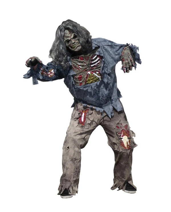 Découvrez le costume complet de zombie pour adulte ! Il contient une chemise grise à manches longues qui est très déchirée laissant apparaître des organes avec du sang, un pantalon assortir ainsi que des gants et un masque qui vous donneront l’aspect d’un véritable zombie ! Avec ce costume il est certain que vous serez le plus terrifiant lors du soir d’Halloween ou pour une soirée thème zombie !