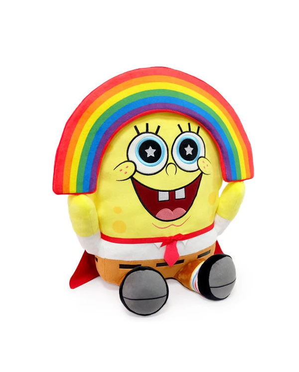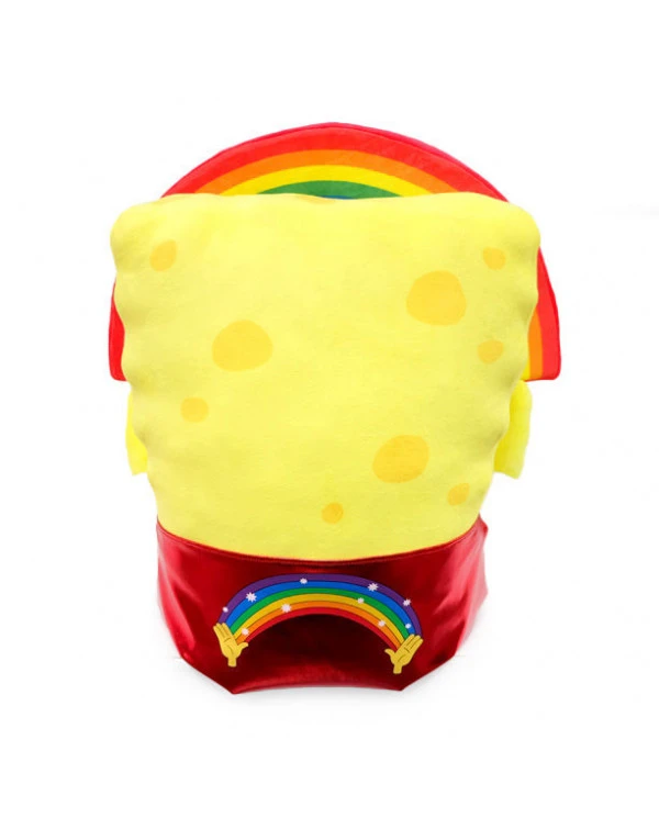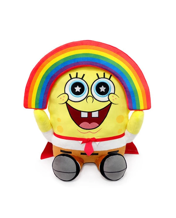 – Peluche vibrante Bob l’éponge jaune avec arc-en-ciel et cape rouge brillante dans le dos