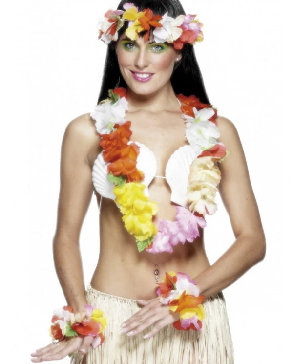 Un kit hawaien « 3 en 1 » à un prix imbattable, comprenant le collier, le bandeau pour la tête et les poignets Le tout composé de jolies fleurs multicolores, pour un effet hawaien garanti, que ce soit pour homme ou pour femme. Vous pourrez compléter votre look des îles avec une jupe en raphia, une chemise exotique ou encore un soutien gorge coquillages (pour les dames).