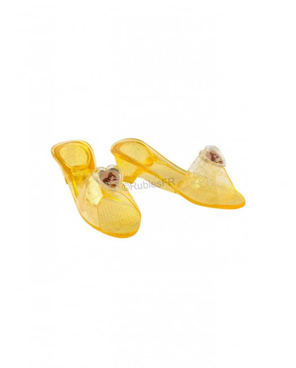 – Chaussures en plastique jaune avec paillettes argentées avec un macaron en forme de coeur sur le dessus à l’effigie de la princesse Belle