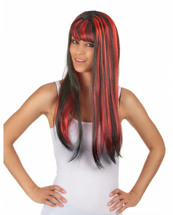– Perruque gothique lisse rouge avec des mèches noires ainsi qu’une frange
